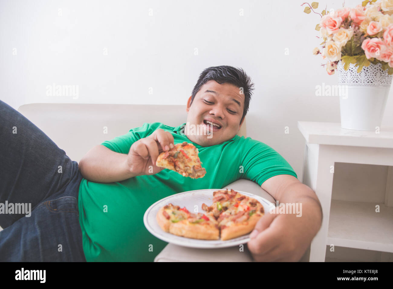 Lazy Sobrepeso Hombre Comiendo Pizza Mientras Tendido En Un Sofa