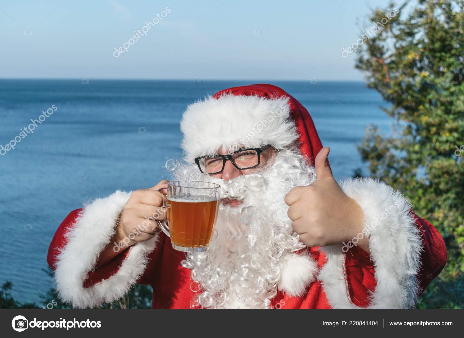 Hombre Gordo Vestido Santa Bebiendo Cerveza Oceano Foto De Stock