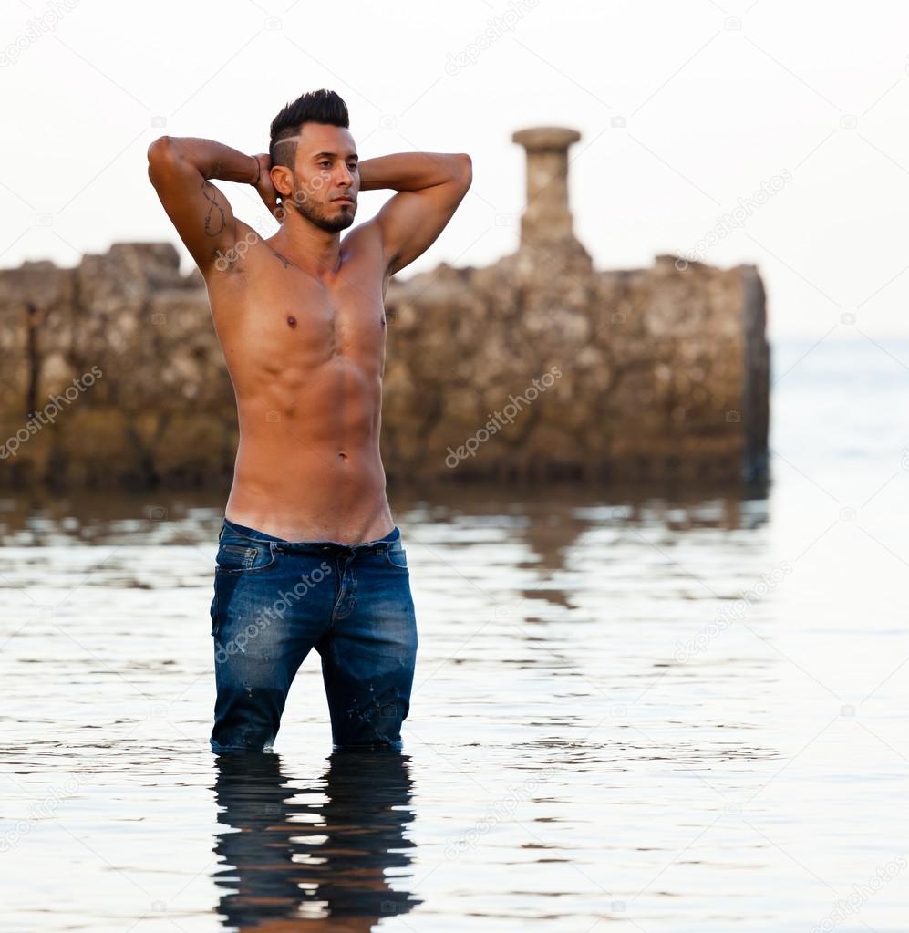 Foto De Homem Bonito Aptidao Muscular Sem Camisa Na Praia Olhando