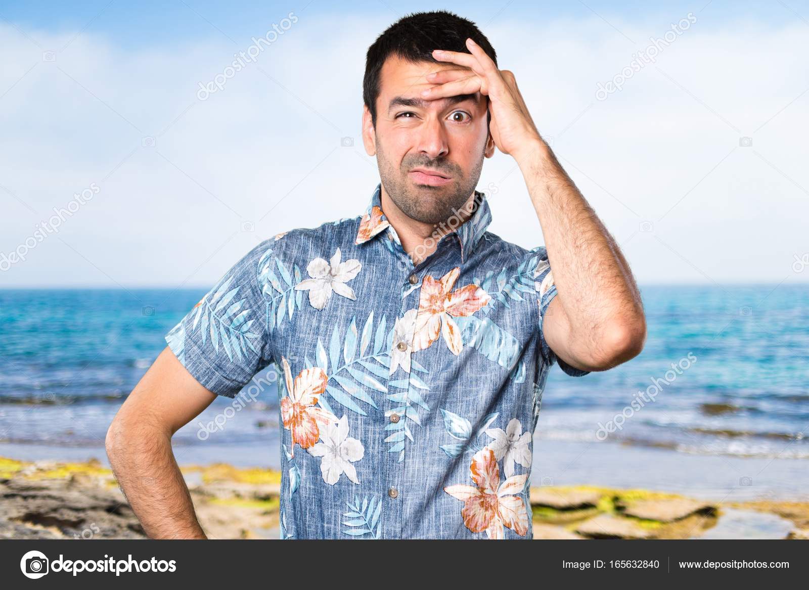 Cansado Homem Bonito Com Camisa De Flor Na Praia Stock Photo